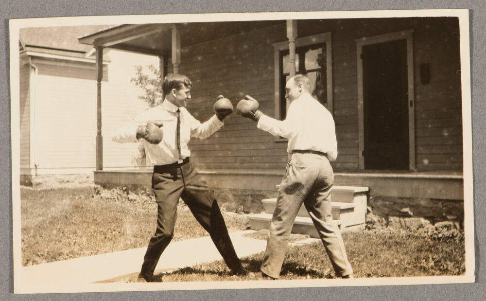 DescriptionImage of two men wearing slacks, collared shirt, and boxing gloves smiling while boxing in front yard.