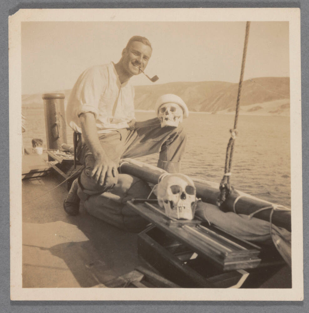DescriptionImage of man on a boat smiling with pipe in mouth and two skulls nearby.