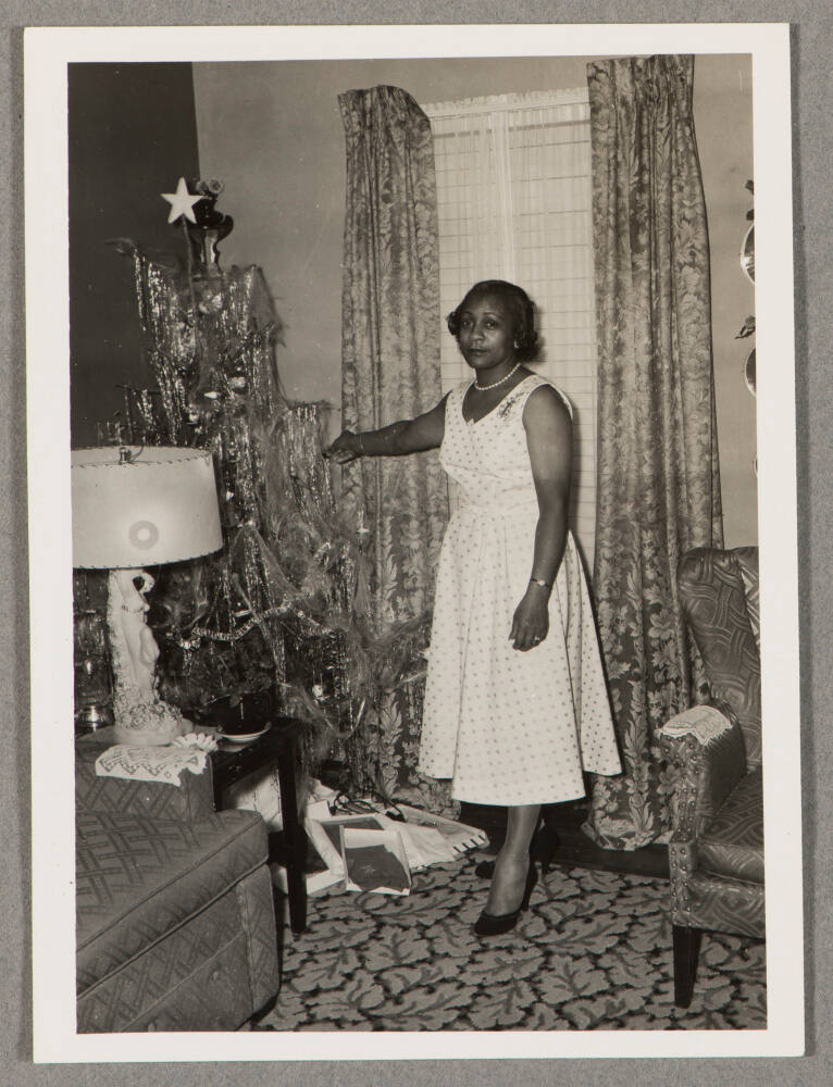 DescriptionImage of woman wearing dress standing next to tinsel-covered Christmas tree.