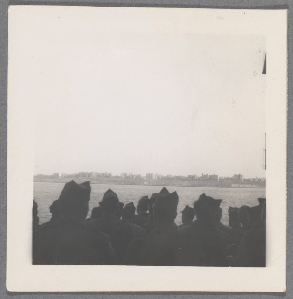 DescriptionImage of group of service men as seen from behind overlooking body of water.