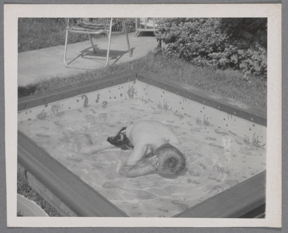 DescriptionImage of boy covering his ears while his face is immersed in the water of a kiddy pool.