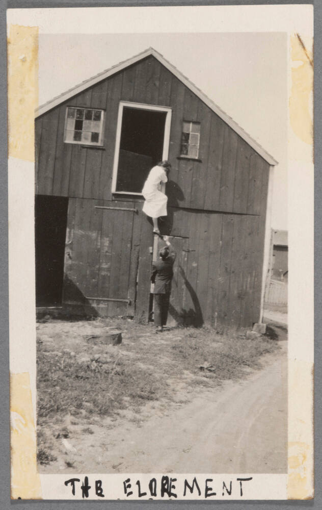 DescriptionImage of woman climbing up to second story barn window with man holding door below.