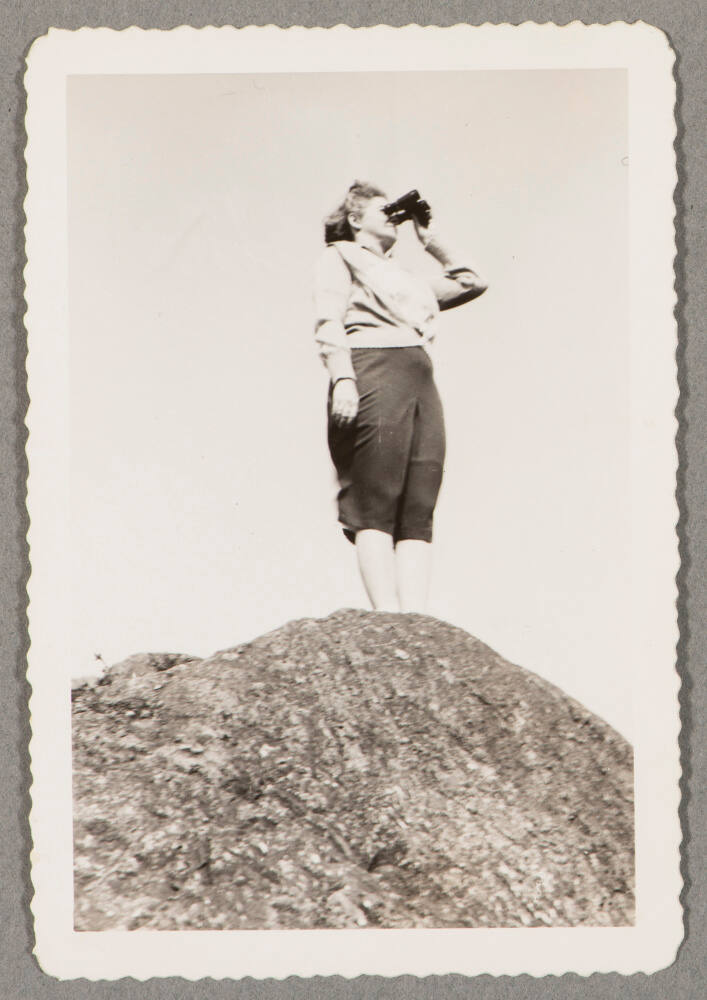 DescriptionImage of woman standing on top of large rock while looking through binoculars.