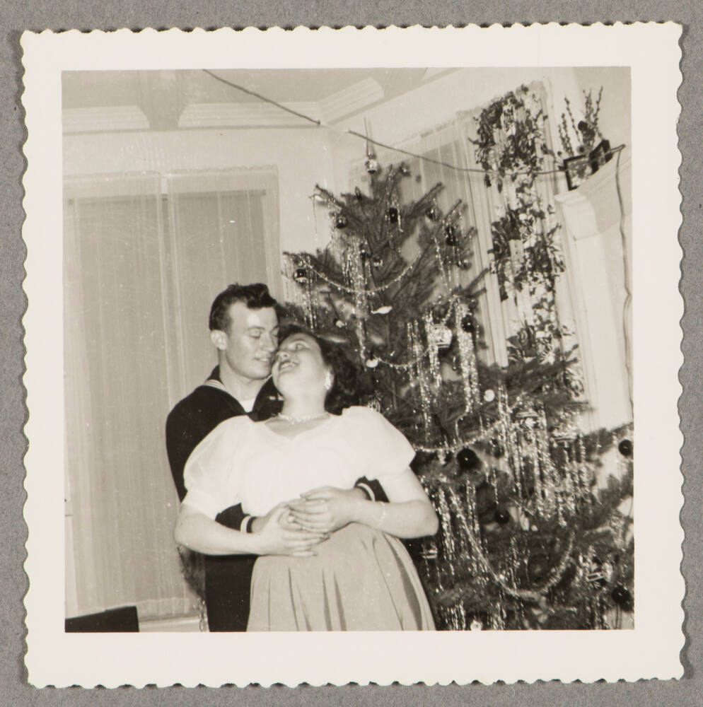 DescriptionImage of couple embracing; woman looking lovingly at man in sailor's uniform while standing in front of Christmas tree.