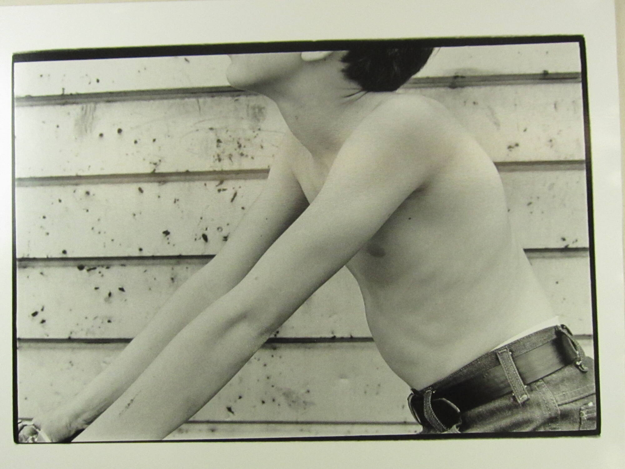 DescriptionProfile image of shirtless boy in front of aluminum siding with arms extended at a downward angle.Copyright© Mark Cohen