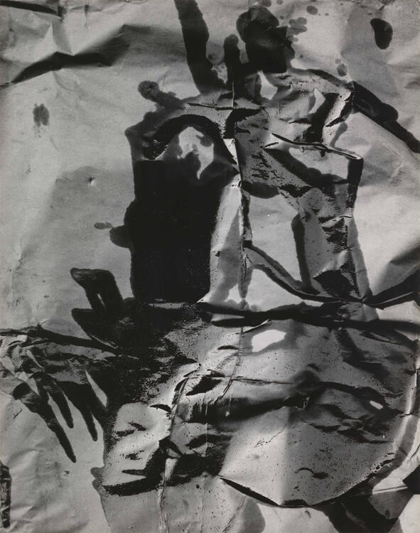 DescriptionAbstract image with shadows, creases, and folds, and a dark void near the center.Copyright© Aaron Siskind Foundation