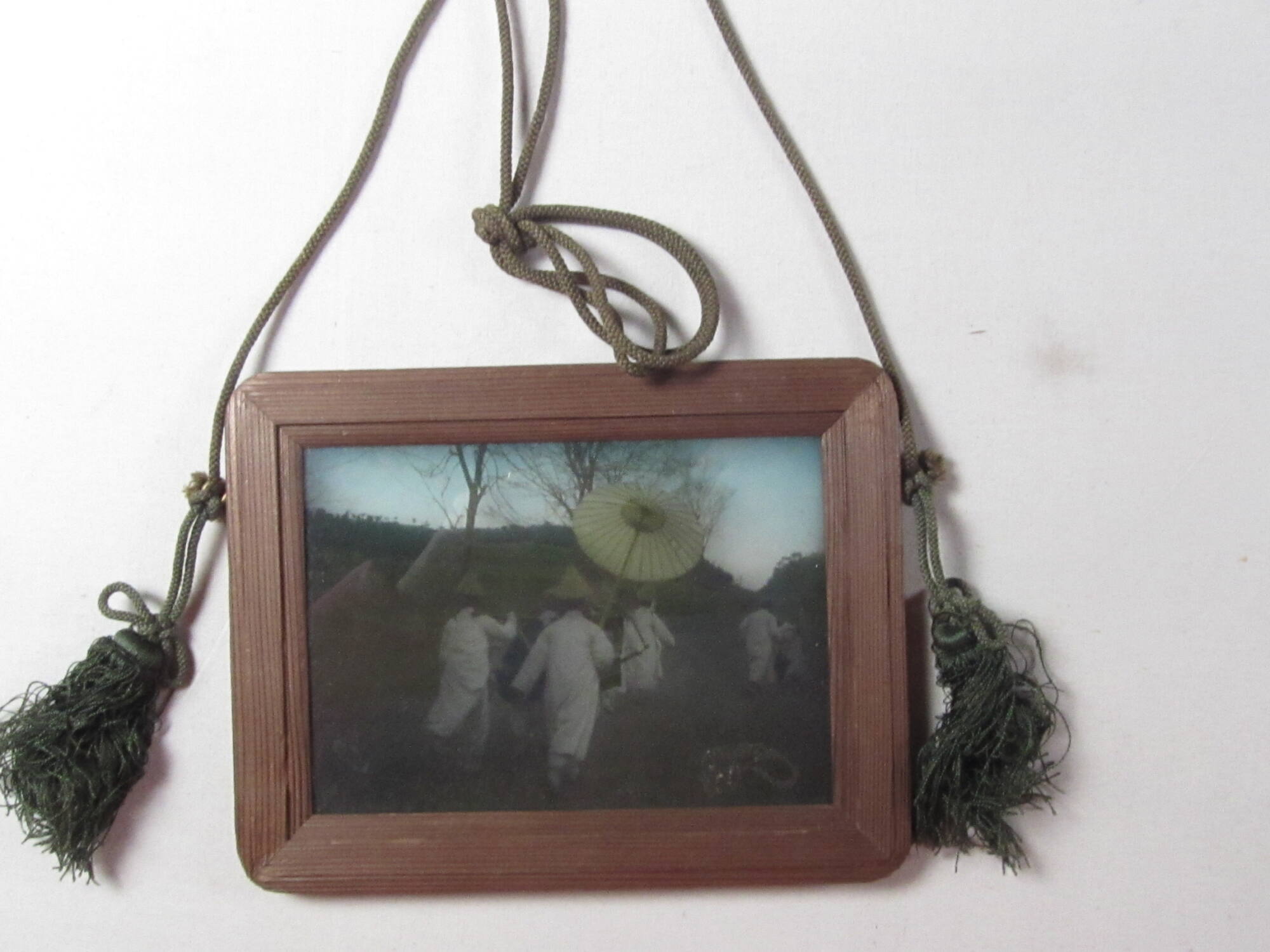 DescriptionThis is a hand-colored silver gelatin dry plate, cased with a cover glass and installed in a wooden frame. Image of Japanese figures wearing cone hats and walking down street with umbrella.