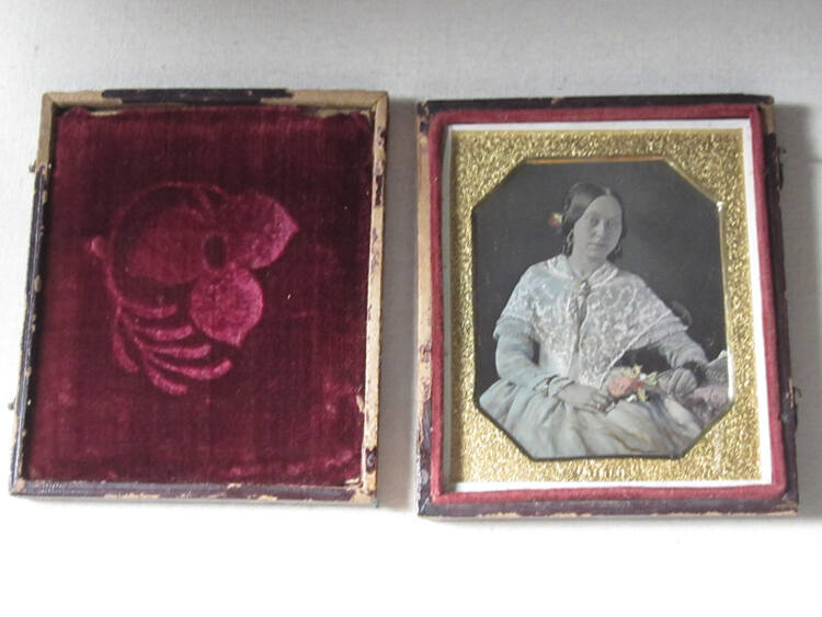 DescriptionSixth plate hand-colored cased daguerreotype housed in brass mat with burgundy velvet liner. Image of woman seated wearing dress and shawl while holding flowers.