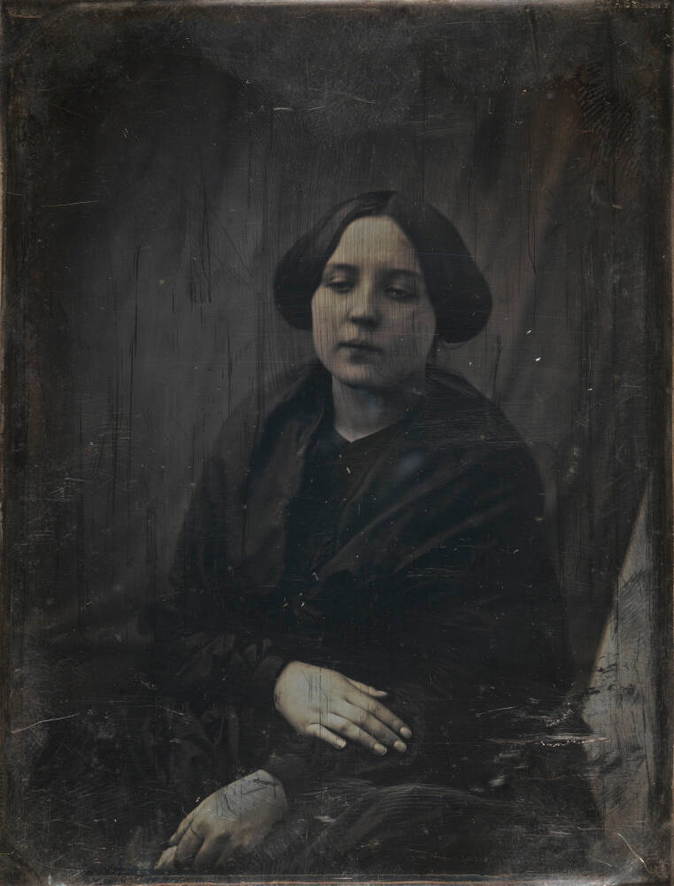 DescriptionImage of a seated woman wearing a shawl with her arms loosely crossed. This quarter plate uncased daguerreotype is housed in a modern replacement paper mat with glass glazing sealed with green paper tape.