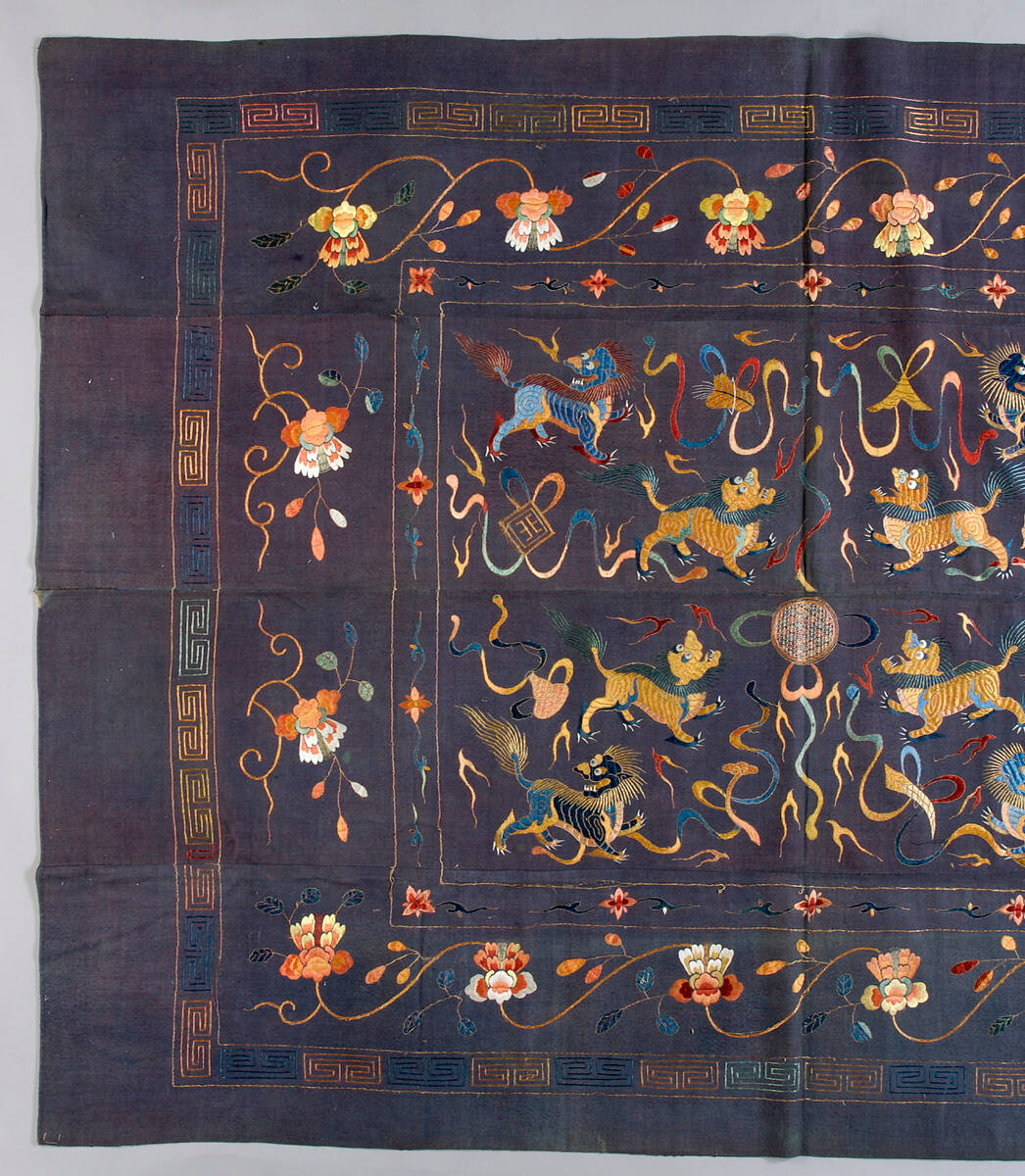 DescriptionBedspread in dark blue felt. Embroidered in the center in silk with dragons and Fu dogs. Border design of flowers.ProvenanceWith Peking Craft Shop, Peking (modern-day Beijing), China, by 1933;