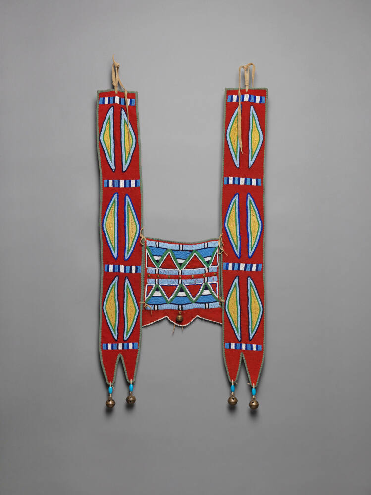 DescriptionA horse collar with a red trade-cloth background with multicolored beaded geomtric designs ornamented with brass bells and buttons.