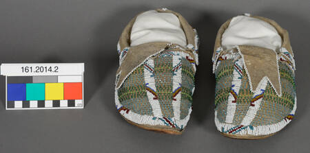 DescriptionA pair of man's moccasins with partially beaded uppers.