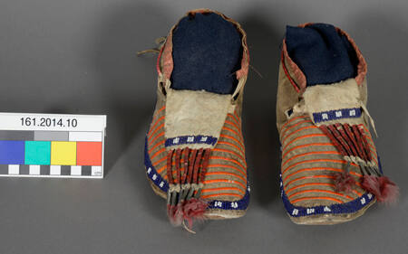 DescriptionA pair of man's quilled moccasins with metal cones and horsehair.