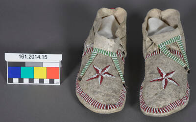 DescriptionA pair of man's moccasins beaded with a star design.