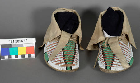 DescriptionA pair of man's moccasins with paritally beaded uppers.