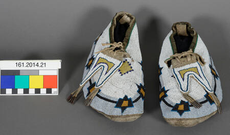 DescriptionA pair of man's moccasins with fully beaded uppers.