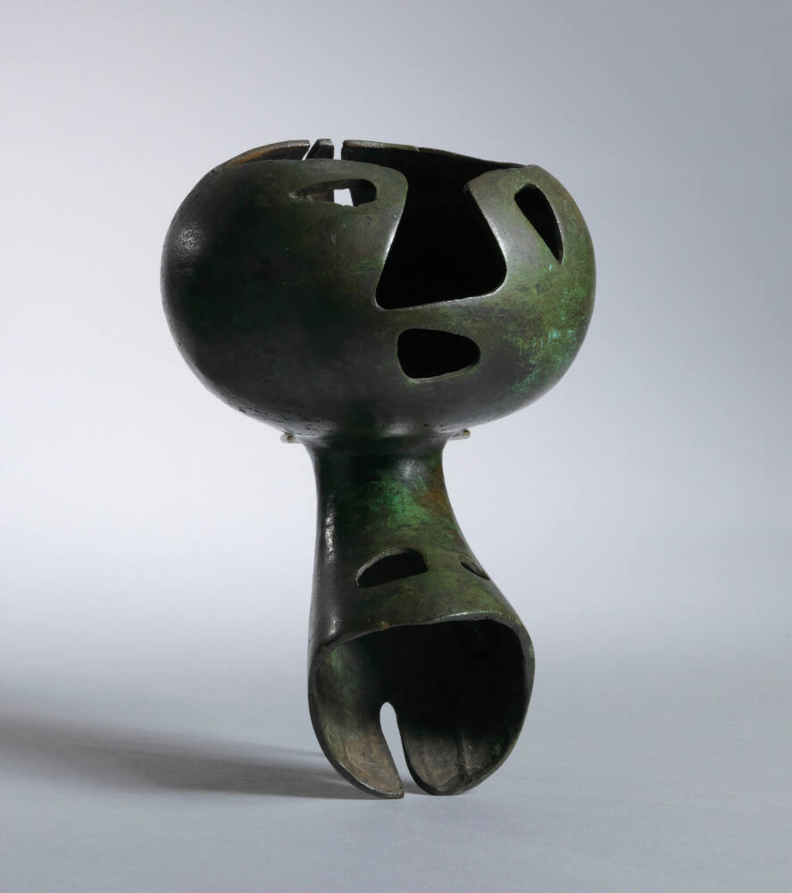 DescriptionThis metal sculpture depicts the simple abstract form of a person’s head and neck lying on its side. The head itself is an empty spherical form with its crown left open. Two eyes are indicated as cut-out ovoids and the mouth is represented by a similar negative space in the form of a circle.Copyright© Mathias Goeritz, 1951. Licensed by L.M. Daniel Goeritz and Galería La Caja Negra, Madrid