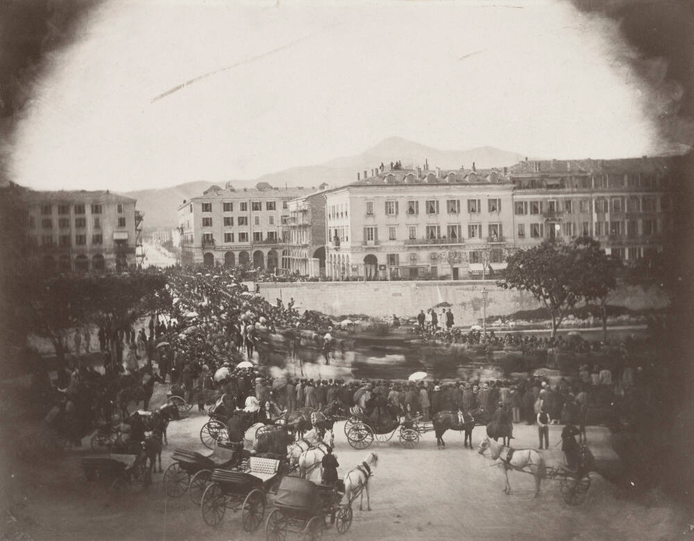 DescriptionImage of crowd gathered for the funeral of Grand Duke Nicolas of Russia. Spectators and horse-drawn carriages fill the road leading past large stone buildings with mountains barely visible in the distance.