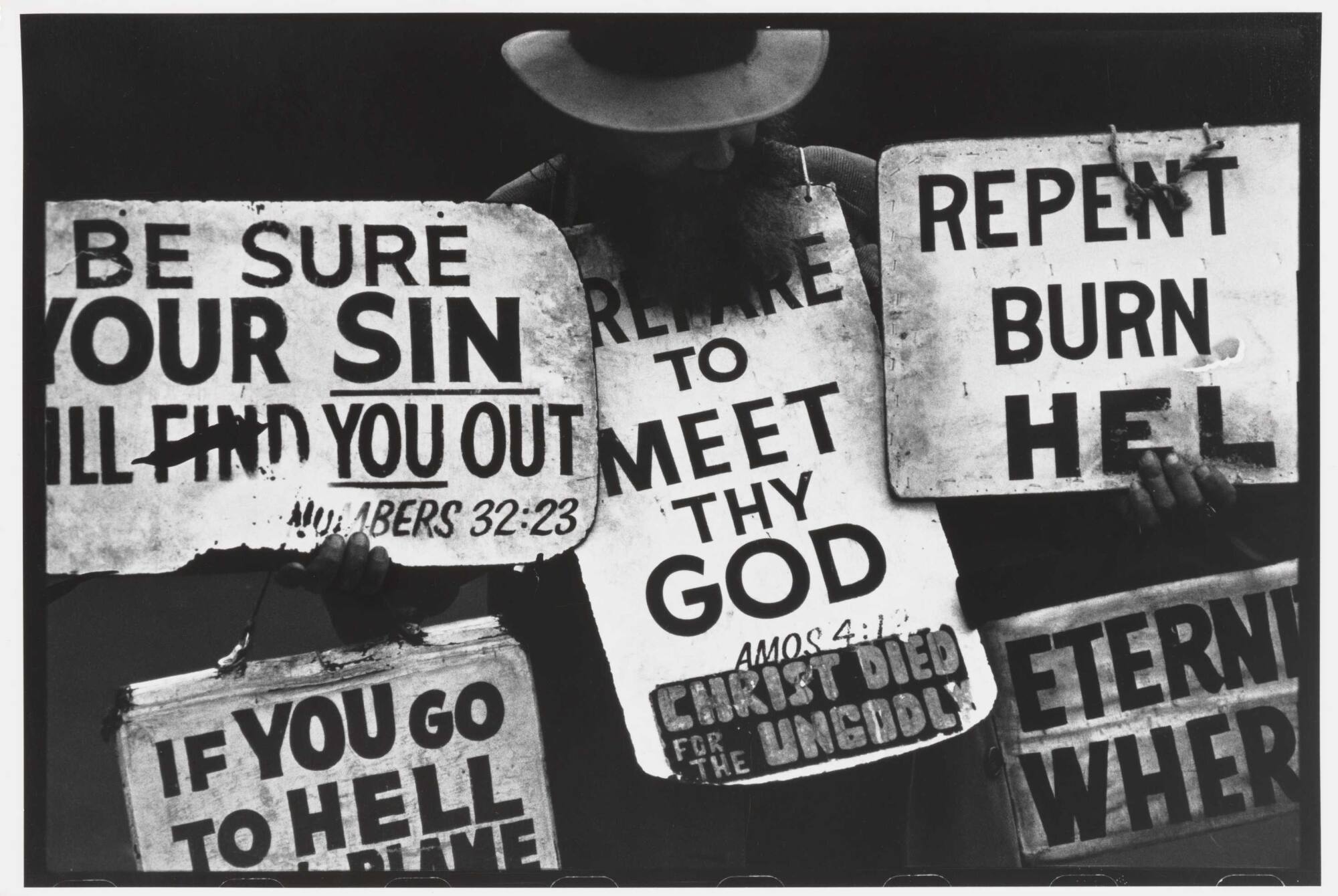 DescriptionImage of man with full beard wearing brimmed hat and looking down at the 5 religious signs he's displaying. They read "Be sure your sin will find you out", "Prepare to meet thy God Christ died for the ungodly”, "Repent Burn Hell", "If you go to Hell...", "Eternal Where...”.ProvenancePurchased from Howard Greenberg Gallery, New York, NY by Jeffrey and Elizabeth Klotz, Pound Ridge, NY;