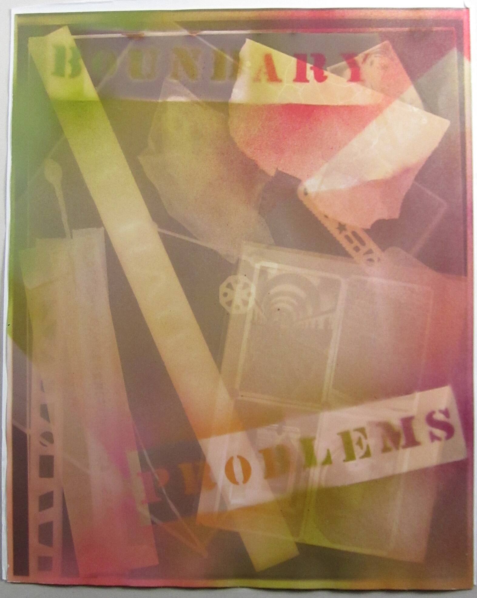 DescriptionUnique photogram covered with pink and yellow spray paint. Image composed of overlapping abstract shapes, photographs of a gate and hallway, and stenciled text which reads "BOUNDARY PROBLEMS".Copyright© Thomas F. Barrow