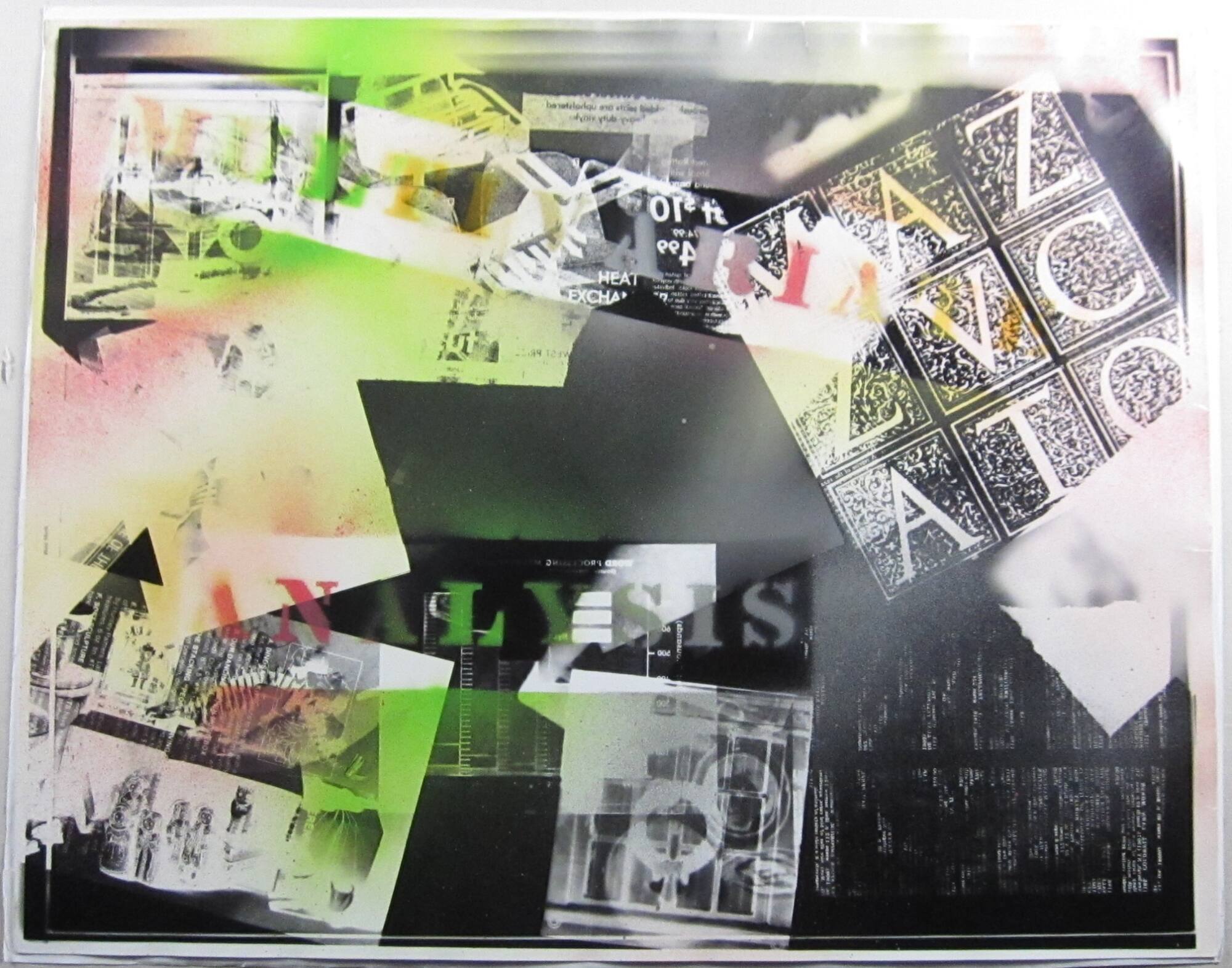 DescriptionUnique photogram covered with pink, green, and yellow spray paint. Image composed of overlapping abstract shapes, paragraphs of reversed text, block letters, and stenciled text which reads "MULTIVARIATE ANALYSIS".Copyright© Thomas F. Barrow