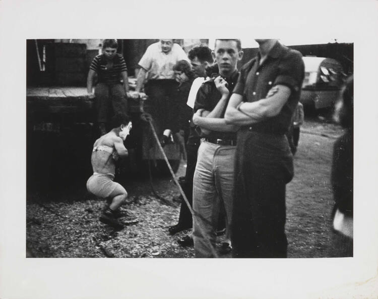 DescriptionImage of a circus dwarf standing behind a rope as two men and children stare at him. His face is painted and he wears tight fitting shorts and a garment around his chest.Copyright© Bruce Davidson/Magnum Photos