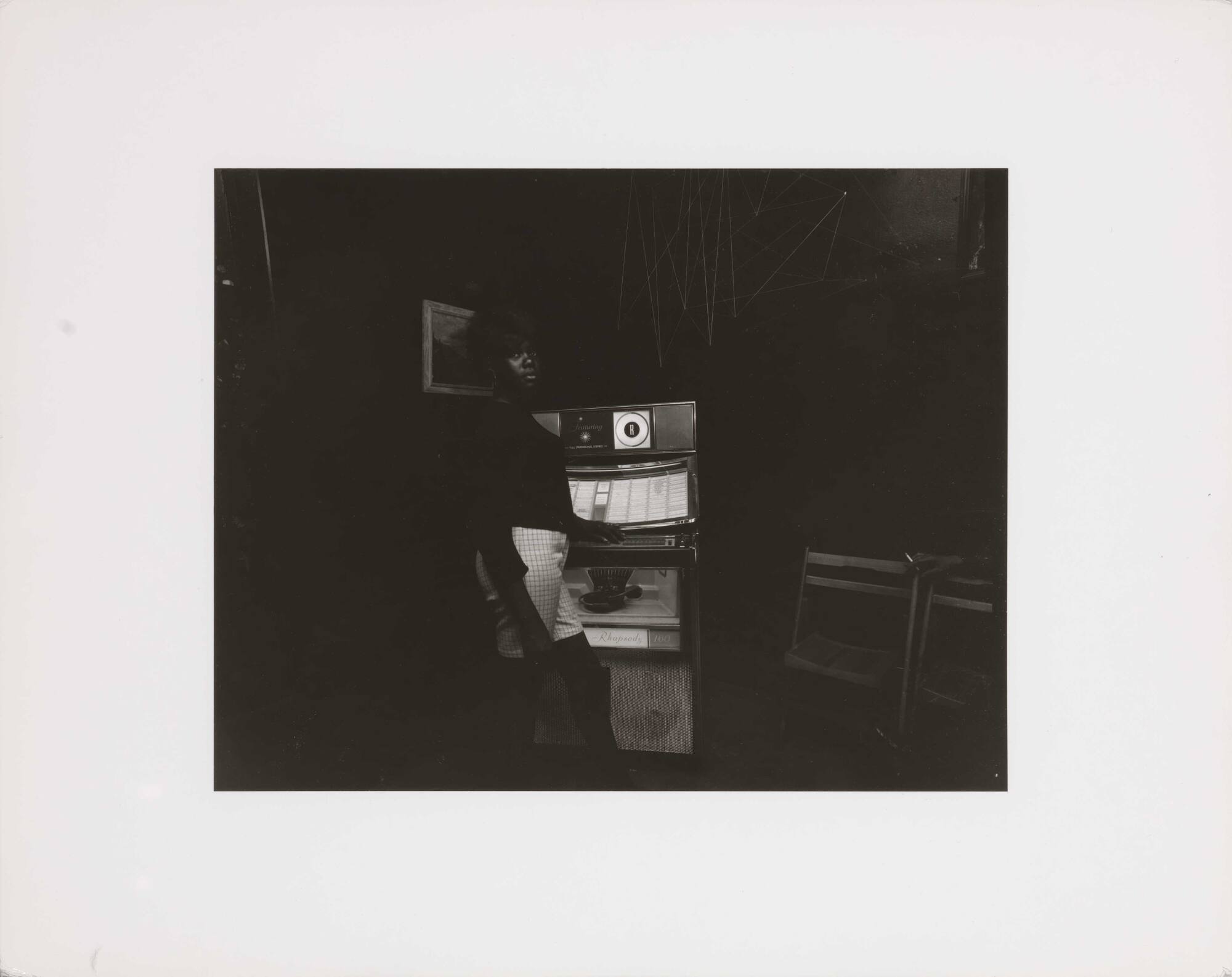 DescriptionDark image of woman wearing checkered shorts resting arm on jukebox and looking back at the camera.Copyright© Bruce Davidson/Magnum Photos