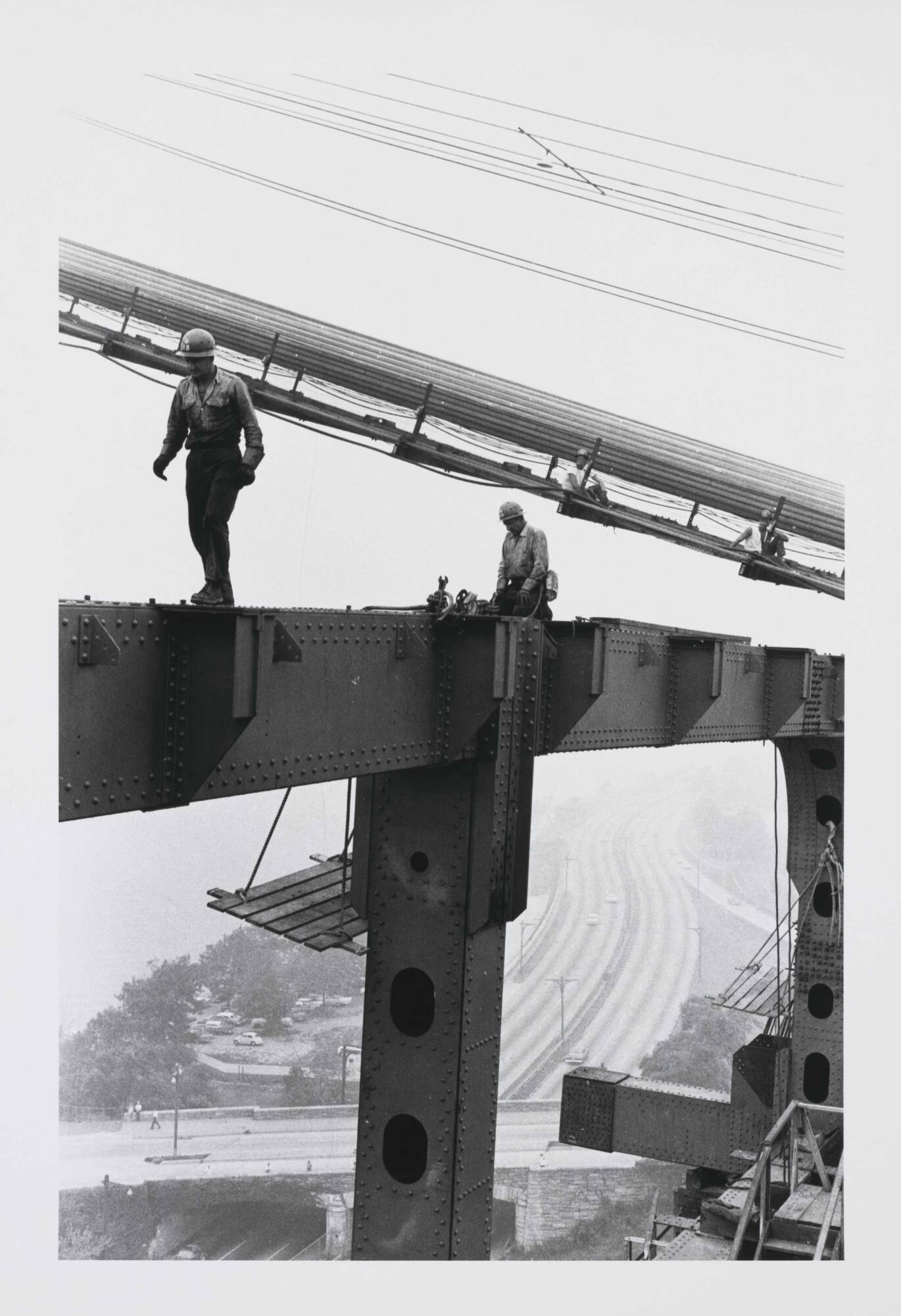 DescriptionImage of construction worker walking across a steel beam as others work on the construction of a suspension bridge (New York City's Verrazano-Narrows Bridge). There are steel cables which stretch across the sky, wooden platforms attached to beams, and cars traveling on the freeway below.Copyright© Bruce Davidson/Magnum Photos