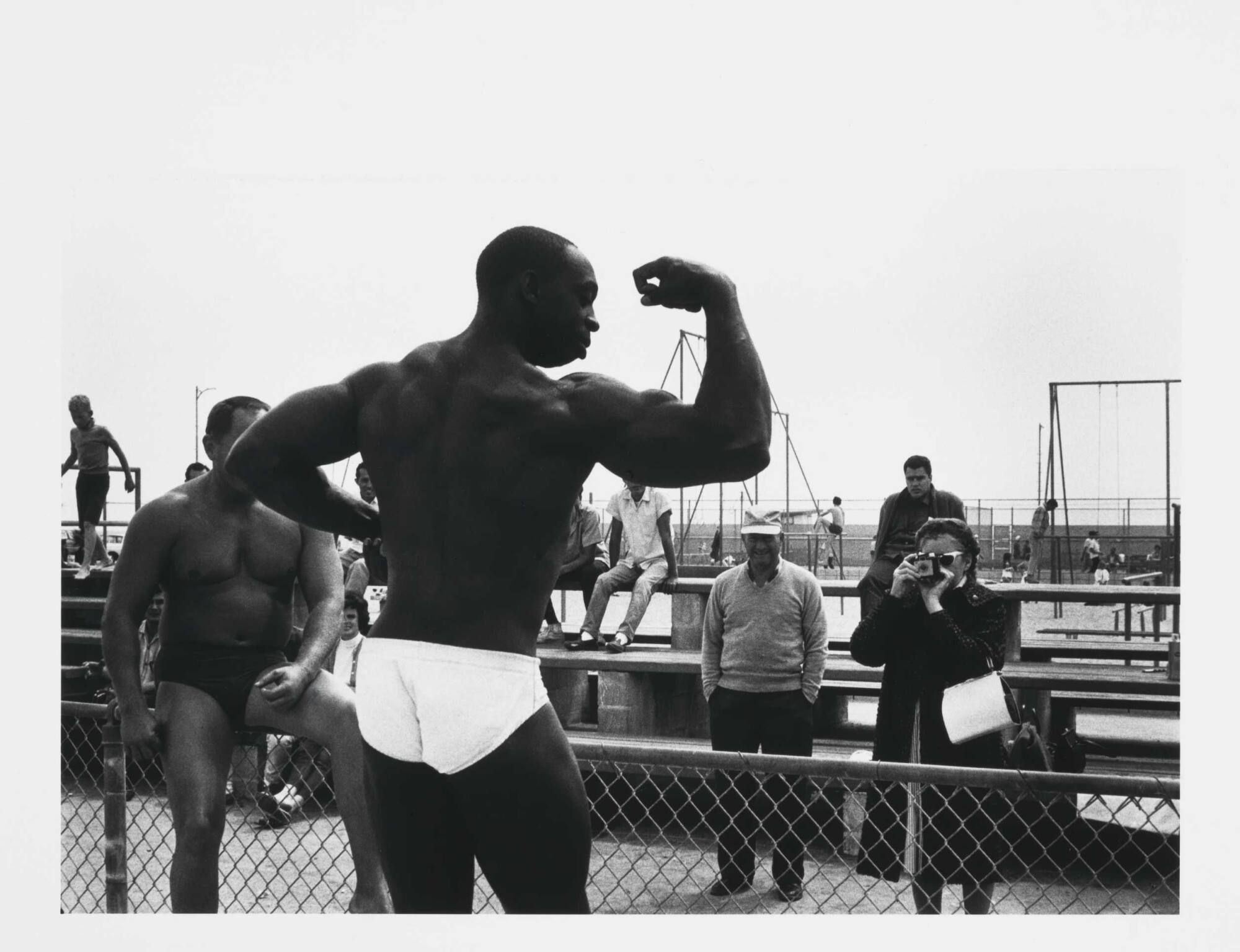 DescriptionImage of a shirtless body builder flexing his muscles as a woman snaps a photograph from the other side of the fence. Onlookers seated on bleachers nearby.Copyright© Bruce Davidson/Magnum Photos