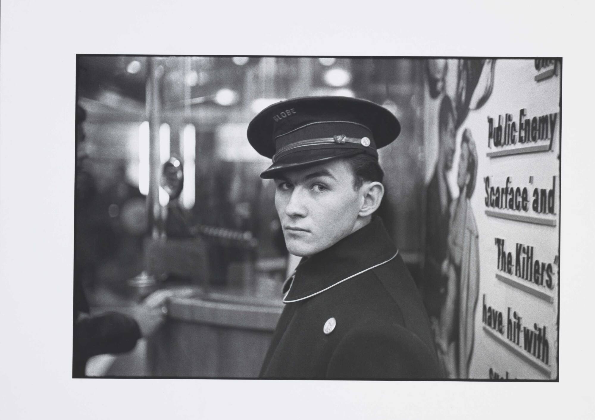 DescriptionImage of young man wearing usher's uniform with cap embroidered "GLOBE" looking back at the camera. He's standing in front of a board listing movie titles with a ticket booth beside him.Copyright© Louis Faurer Estate, courtesy Howard Greenberg Gallery