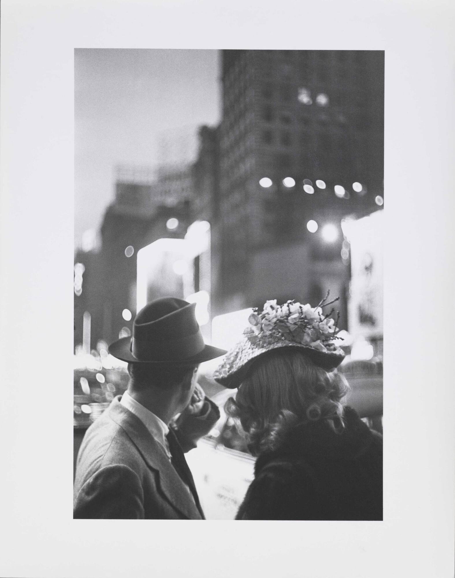 DescriptionImage of couple wearing hats and coats seen from behind as they look towards street full of skyscrapers and street lights.Copyright© Louis Faurer Estate, courtesy Howard Greenberg Gallery