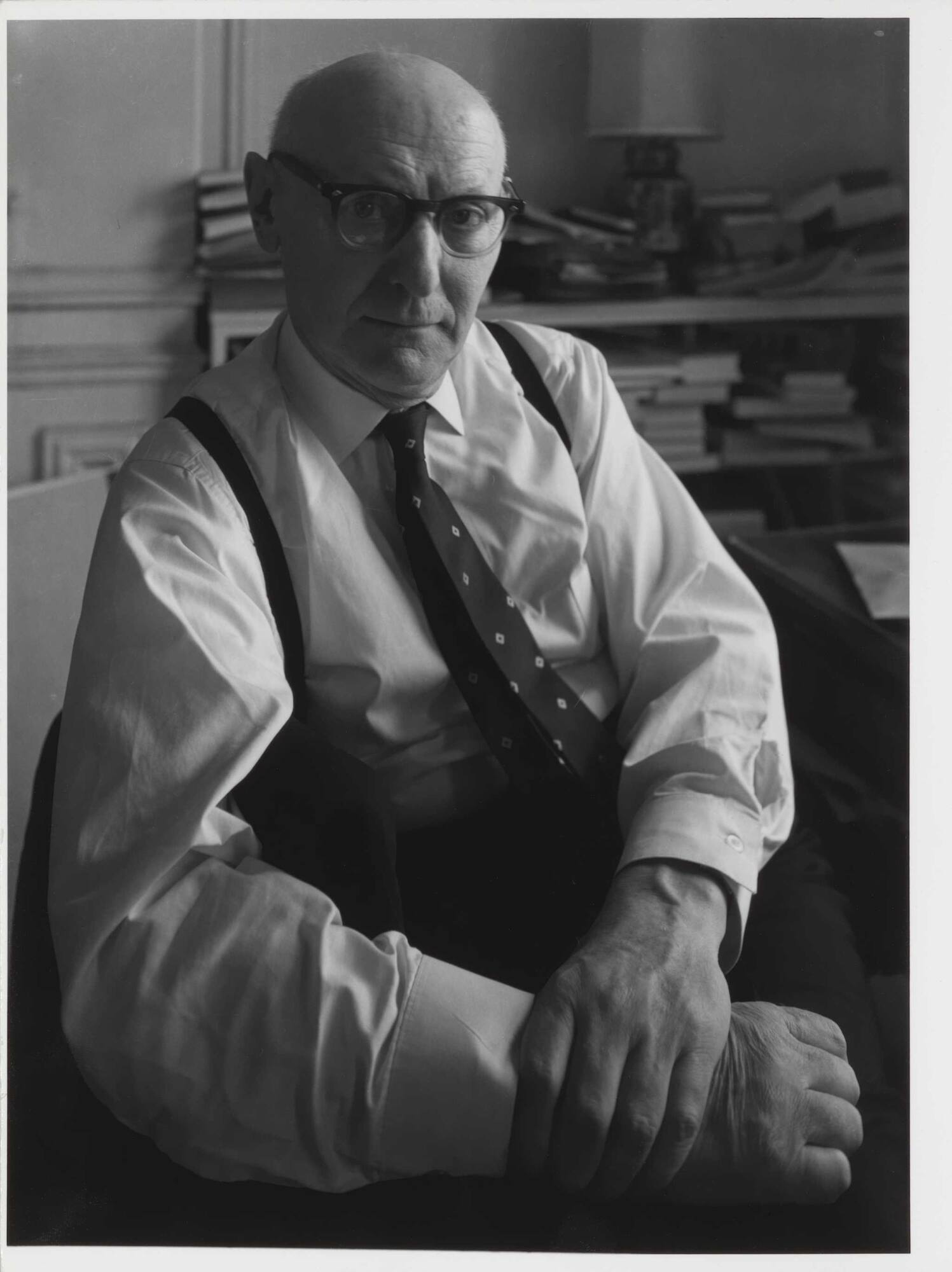 DescriptionPortrait of Isaac Beshevis Singer seated with hand on wrist. He is wearing glasses, collared shirt, and tie with suspenders. Unorganized piles of books line the shelves behind him.Copyright© Estate of Arnold Newman