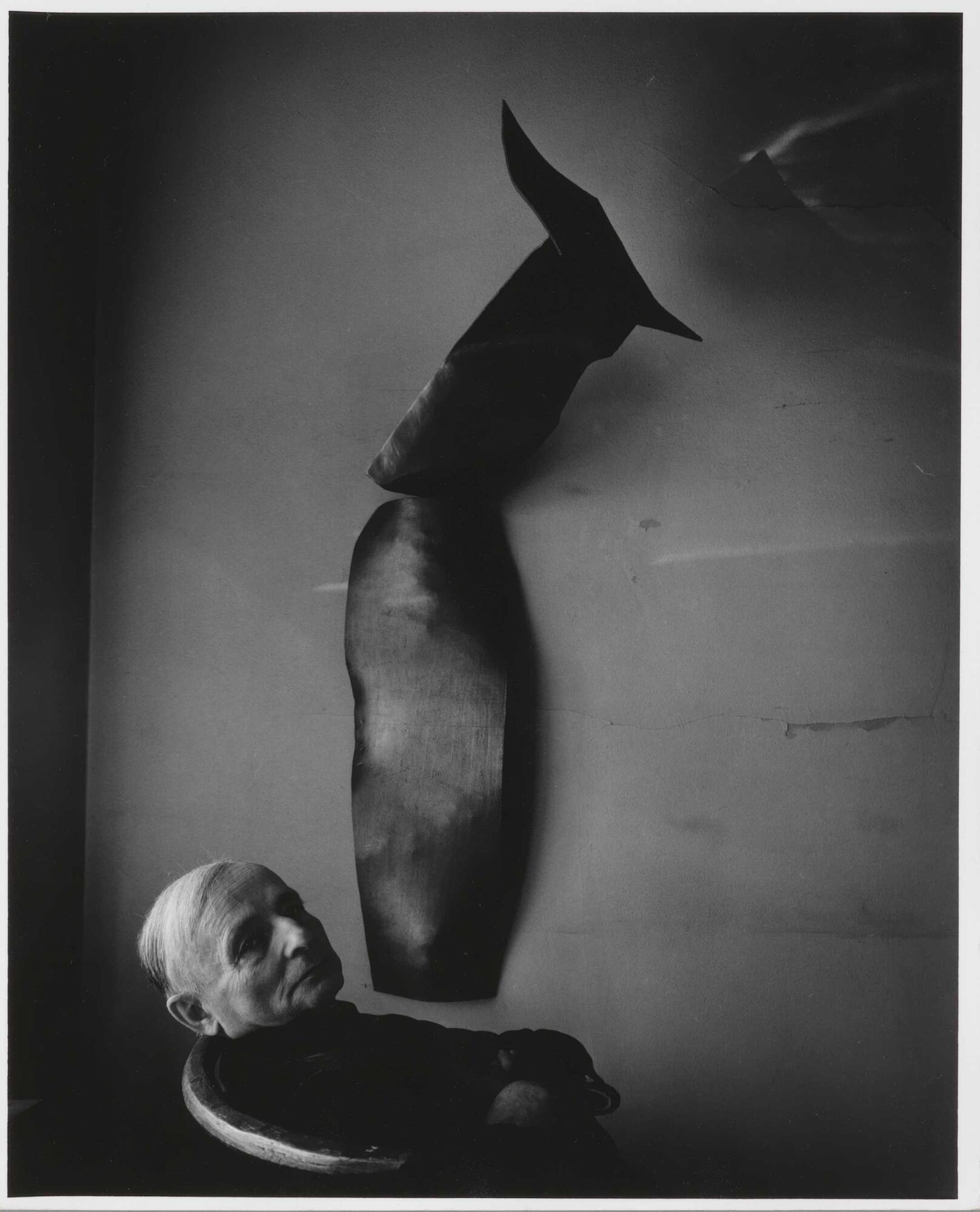 DescriptionPortrait of Frederick Kiesler leaning back in chair with light coming in from behind and abstract sculpture hanging on wall beside him.Copyright© Estate of Arnold Newman