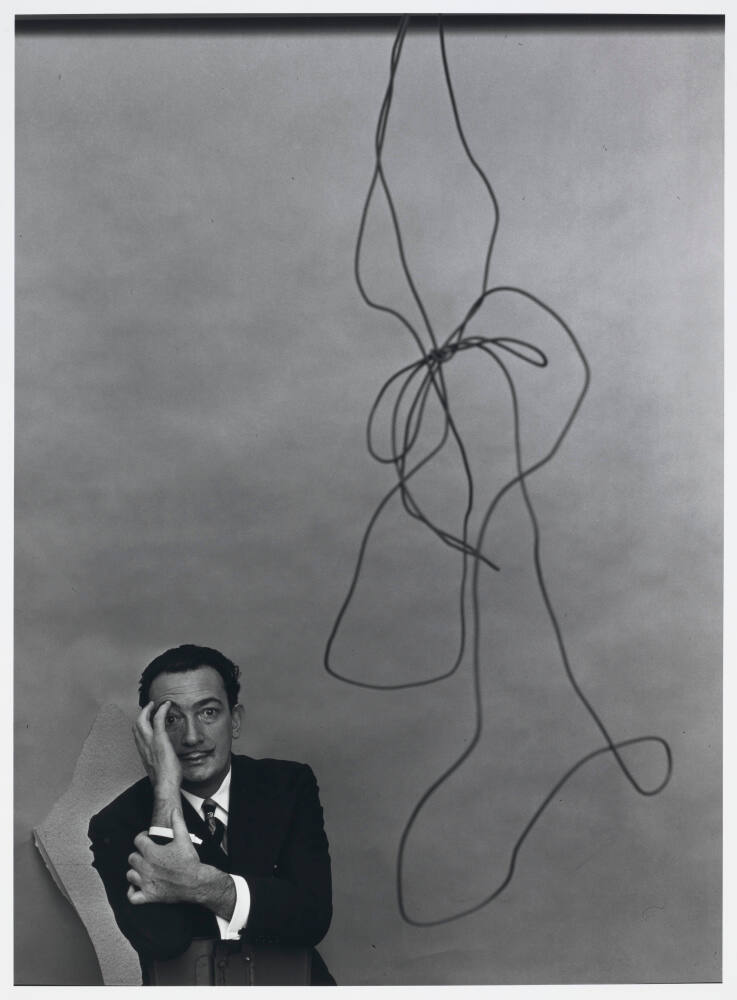DescriptionPortrait of Salvador Dali seated next to tangled wire hanging from above, wearing suit and tie with arms crossed.