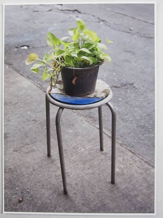 DescriptionImage of a "parking place blocker" constructed of a potted plant on top of a round stool with a partially torn blue seat.Copyright© Enver Hirsch