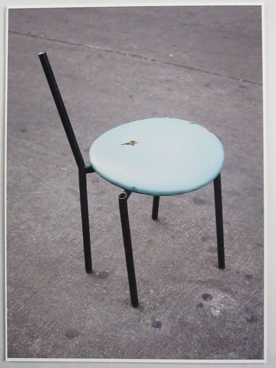 DescriptionImage of "parking place blocker" constructed of a chair with a blue seat and broken back.Copyright© Enver Hirsch