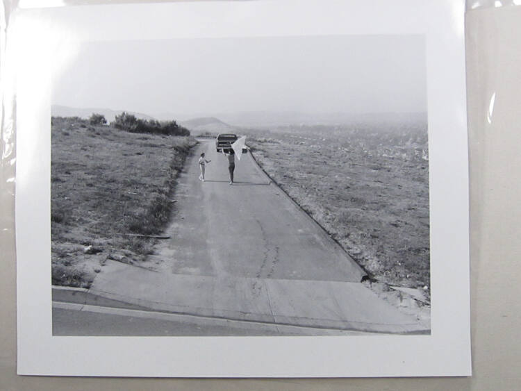DescriptionImage of a woman and a child flying a kite on a small stretch of road surrounded by grass overlooking a town. There is a parked car at the end of the road.Copyright© Estate of Joe Deal
