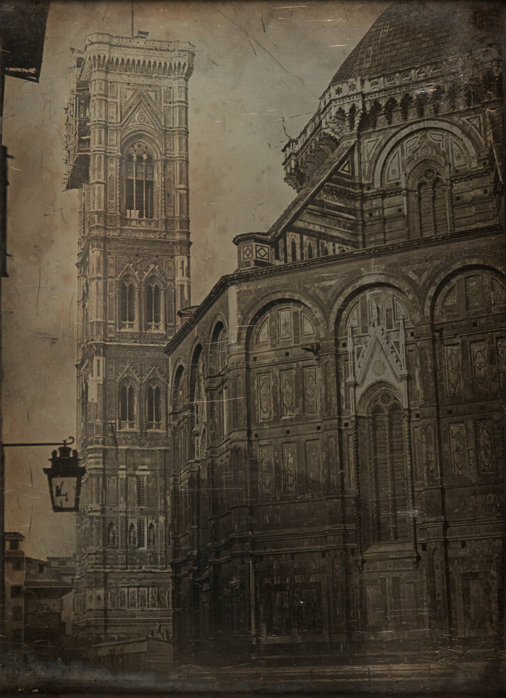 DescriptionImage of ornate cathedral facade with bell tower and street lantern. This half plate uncased daguerreotype is housed in a modern mat with cover glass.