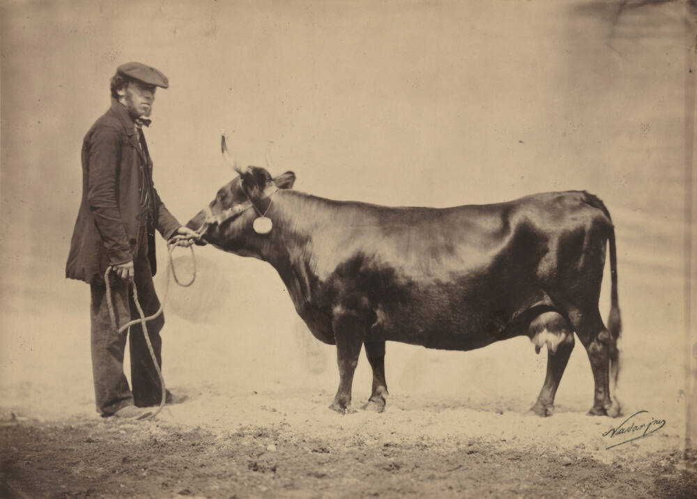 DescriptionImage of a bearded man in jacket, boots and hat standing next to a steer and holding its rope and harness.