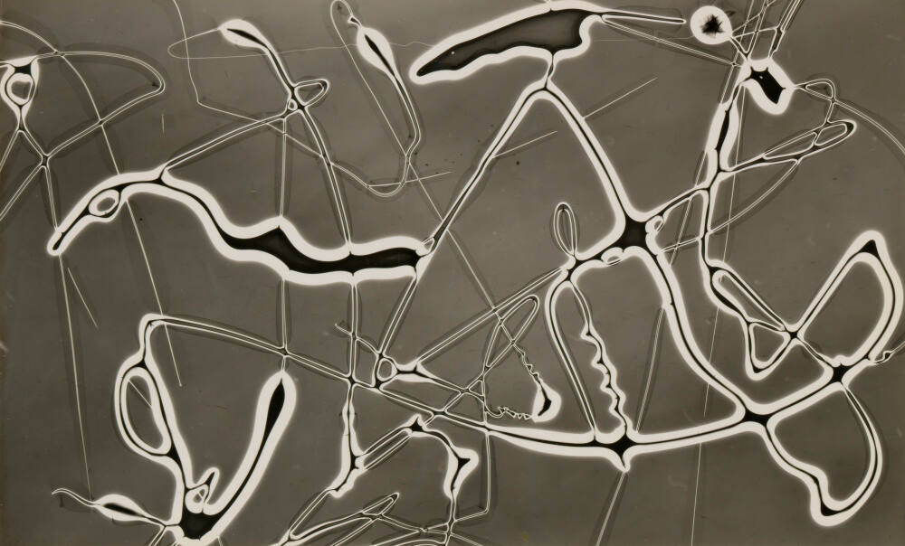 The organic forms of this dynamic composition recall the paintings of Jackson Pollock. Herbert Matter befriended Pollock in the 1940s and found inspiration in the painter’s expressive brushwork. He experimented frequently during this decade with a similar visual vocabulary. To make this camera-less image, Matter likely poured a thick, liquid substance on a piece of glass and then exposed a sheet of light-sensitive paper beneath.