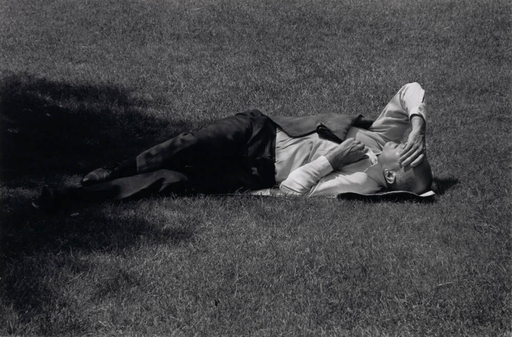 DescriptionImage of man wearing suit lying on grass (partially in shade) with hand covering face.Copyright© Michael Torosian