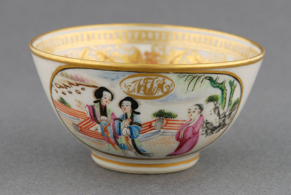 DescriptionPart of seventy-seven piece tea and coffee service. In bottom of saucer and on interior sides of cups is a scene painted in Famille rose style showing two Chinese ladies and attendent in garden. Above figs is gold monogram, MTA, in gold oval. On interior sides of all pieces is border design in gold of grape bunches and leaves. On handleless cups on exterior side is also a gold spray of leaves and berries.