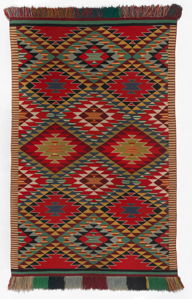 DescriptionWoven tapestry featuring complex designs of interwoven serrated diamonds organized in a grid.Published ReferencesTorrence, Gaylord, ed. Continuum: North American Native Art at the Nelson-Atkins Museum of Art. Kansas City: Nelson-Atkins Museum of Art.