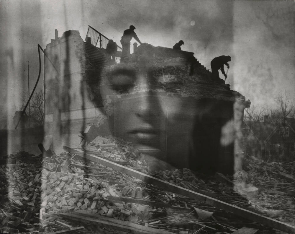 DescriptionComposite duotone print. Layered images which include a portrait of a woman with eyes closed and men standing on top of a crumbling structure with bricks piled on ground below and other homes in background.Copyright© Edmund Teske Archives / Laurence Bump and Nils Vidstrand