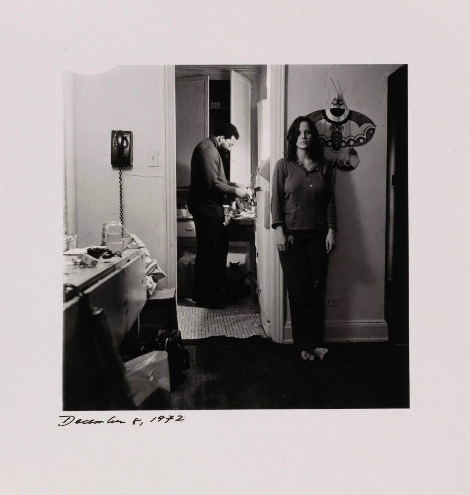 DescriptionSelf-portrait of woman standing against wall with man and cat just beyond doorway. There is a rotary phone and butterfly decoration mounted on the wall.Provenance