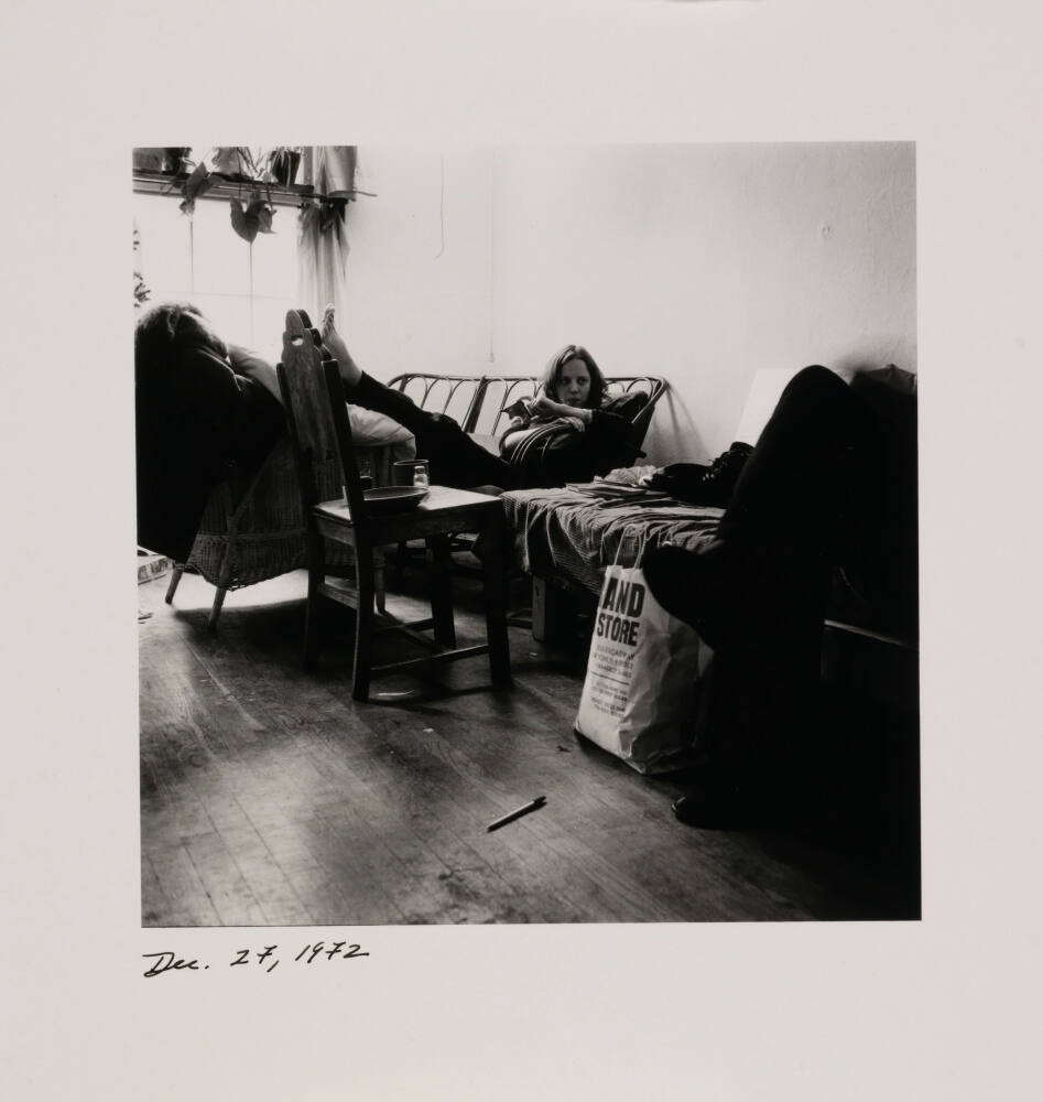 DescriptionSelf-portrait of woman seated on futon while eating toast; she is looking towards a figure who is partially cropped from frame.Provenance