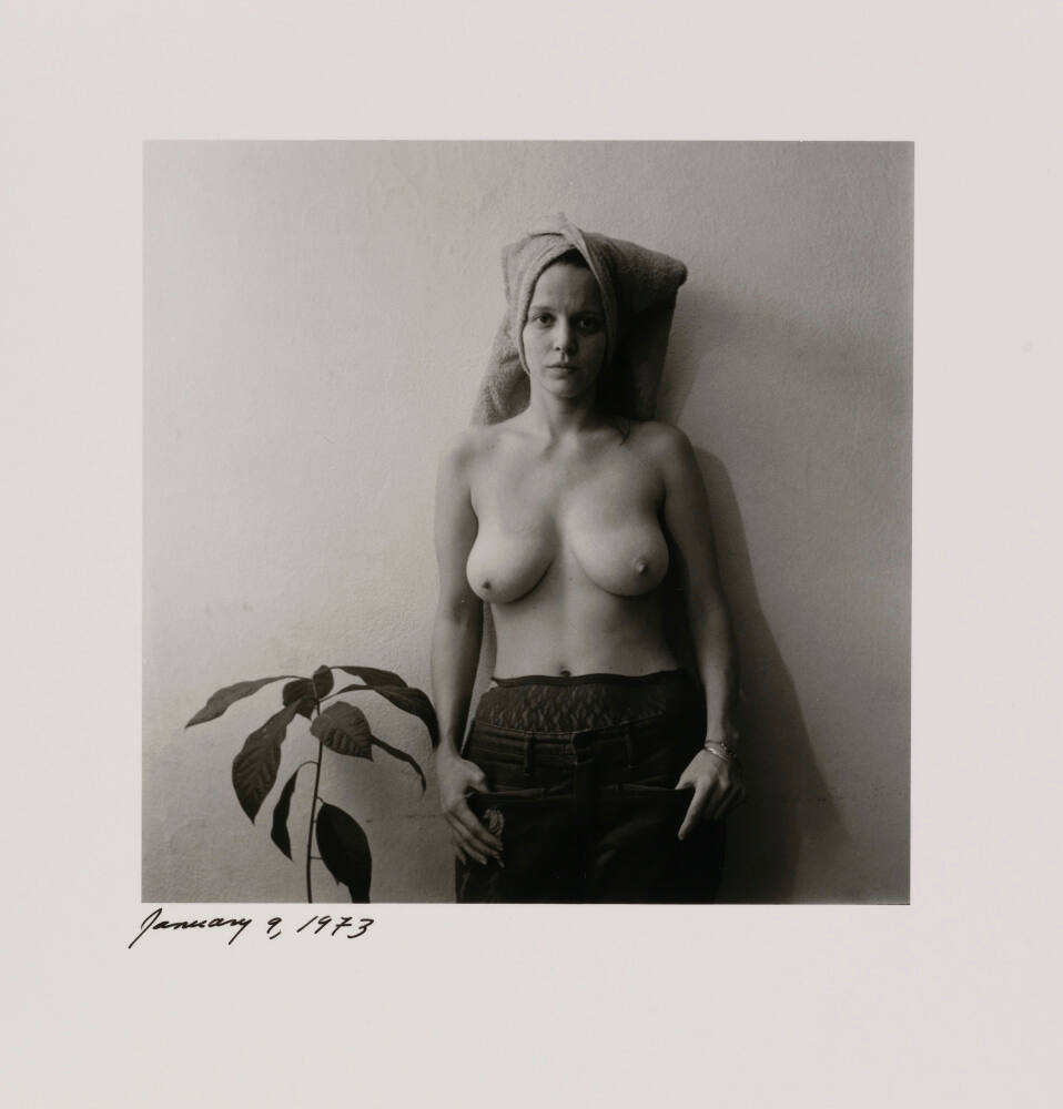 DescriptionSelf-portrait of topless woman with hair wrapped in towel and thumbs in pockets; she's standing against a wall beside a plant.Provenance
