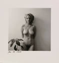 DescriptionSelf-portrait of nude woman with slight smile standing against wall with towel wrapped around hair.Provenance