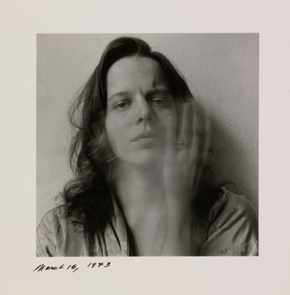 DescriptionSelf-portrait of woman wearing robe and hand moving across face.Provenance