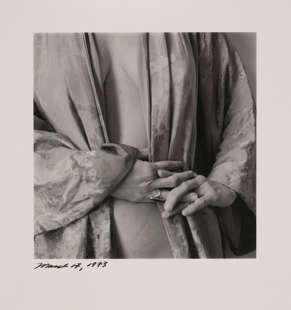 DescriptionSelf-portrait of woman's torso. She's wearing floral robe, partially open, with hands clasped across stomach.Provenance